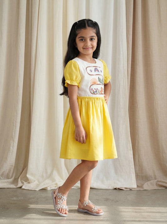Elegant Yellow Cotton Gauze Fit & Flare Dress with Sea-Life Embroidery & Soft Frilled Sleeves