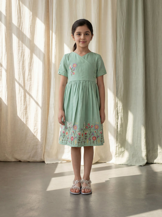 Elegant Sage Green Angrakha Dress with Delicate Floral Embroidery & Appliqué Butterfly Detail