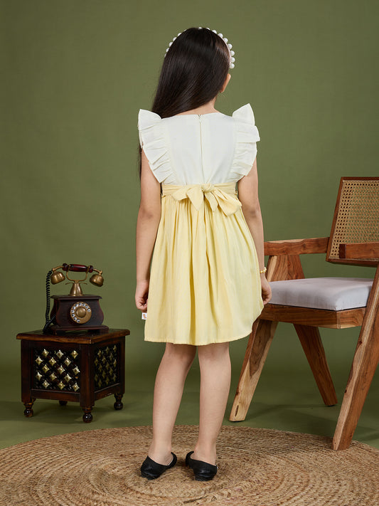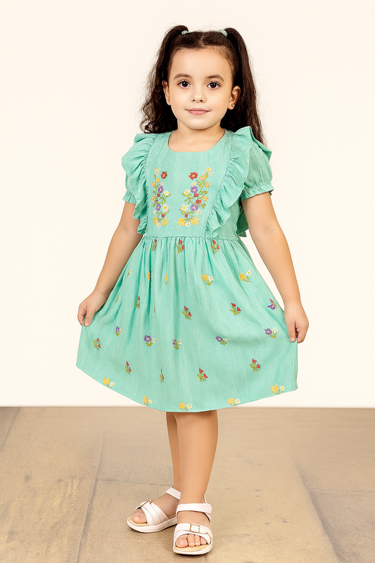 TINY TWILLS Girls Cotton Frock – Dress with Ruffled Sleeves & Colorful Floral Embroidery | Adorable Summer Party Wear for Kids