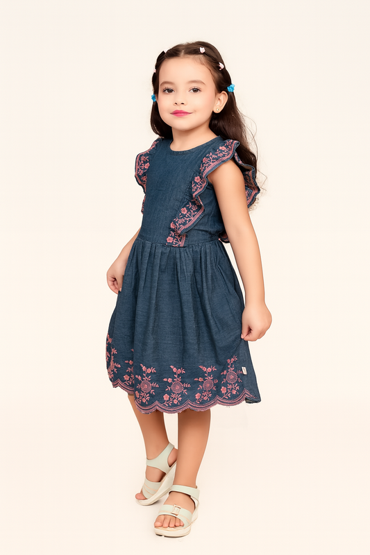 TINY TWILLS Girls Denim Frock – Sleeveless Blue Dress with Pink Floral Embroidery & Scalloped Hem | Elegant Western Party Wear for Kids
