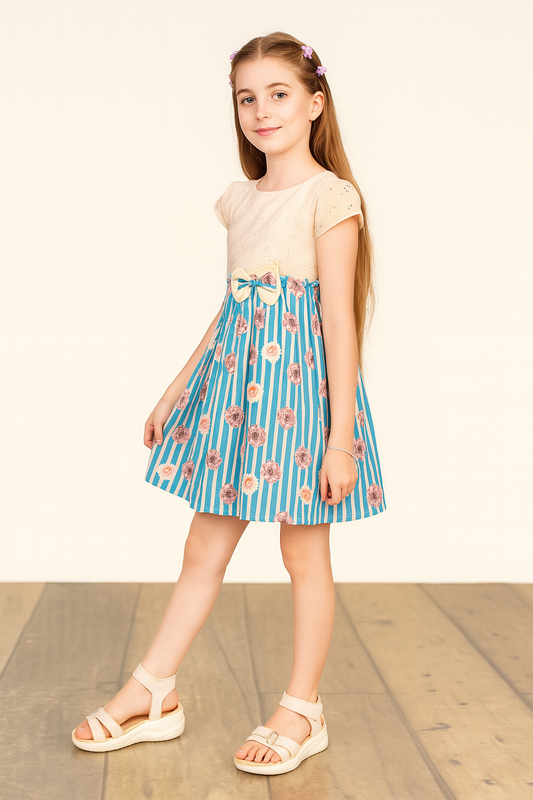 TINY TWILLS Girls Floral Frock – Cream Top with Blue Striped Skirt & Bow | Summer Cotton Party Dress for Kids