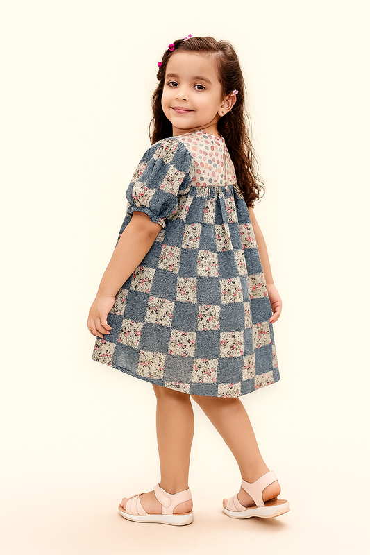 TINY TWILLS Girls Cotton Frock – Checkered Patch Dress with Floral Print & Tassel Detail | Casual Flared Dress for Girls