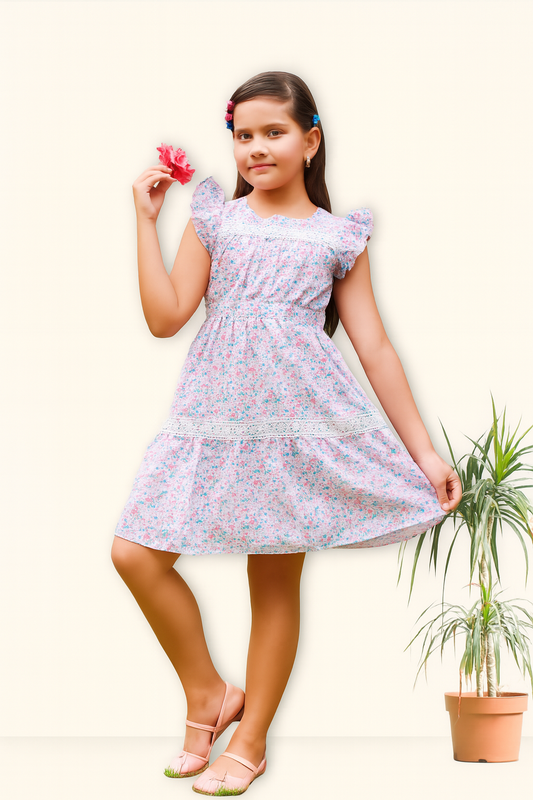TINY TWILLS Girls Cotton Frock – White Dress with All-Over Floral Print, Ruffle Sleeves & Lace Panels | Soft Summer Casual Wear for Kids