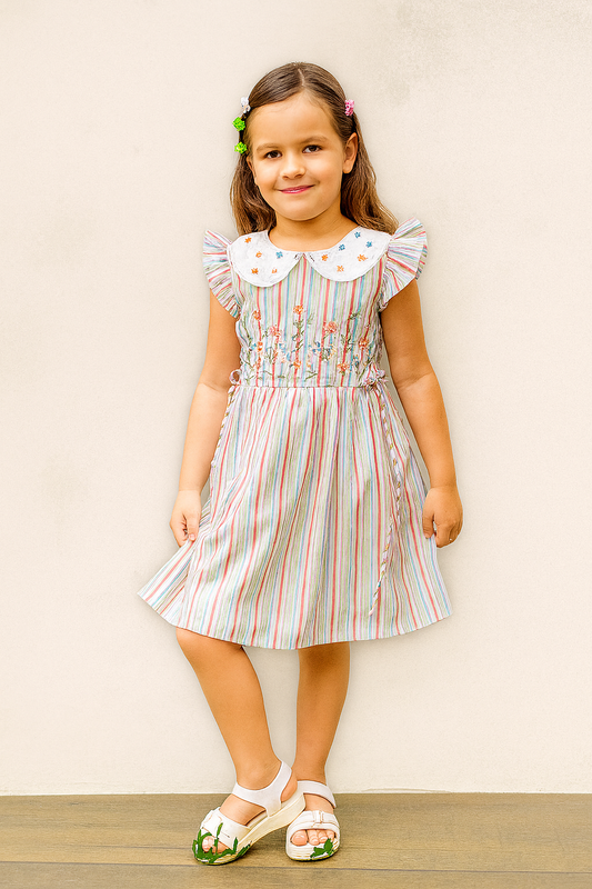 TINY TWILLS Girls’ Multicolor Striped Cotton Frock – Embroidered Waist & Peter Pan Collar | Summer Casual Dress