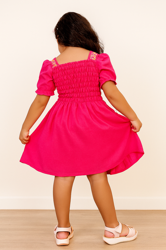 TINY TWILLS Girls' Smocked Frock with Puff Sleeves & Floral Embroidery – Festive Party Dress