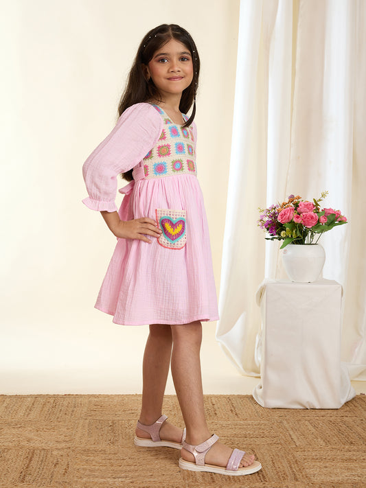 TINY TWILLS Girls Cotton Frock – Cream Dress with Colorful Crochet Bodice & Patch Pockets | Handcrafted Boho Style Ethnic Wear for Kids