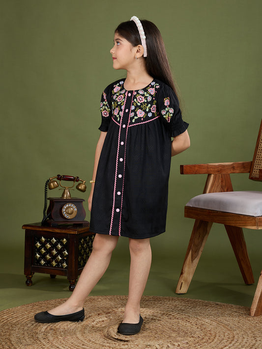 TINY TWILLS Girls Black Cotton Frock – Floral Embroidered Dress with Pink Button Detailing & Puff Sleeves | Ethnic Party Wear for Kids