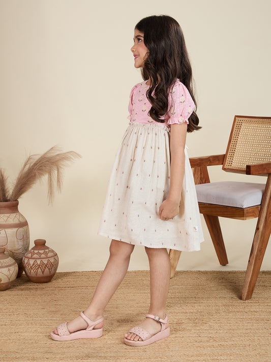TINY TWILLS Girls Cotton Frock – Embroidered Puff Sleeve Dress in Pink with Contrast Skirt | Stylish Ethnic Wear for Kids