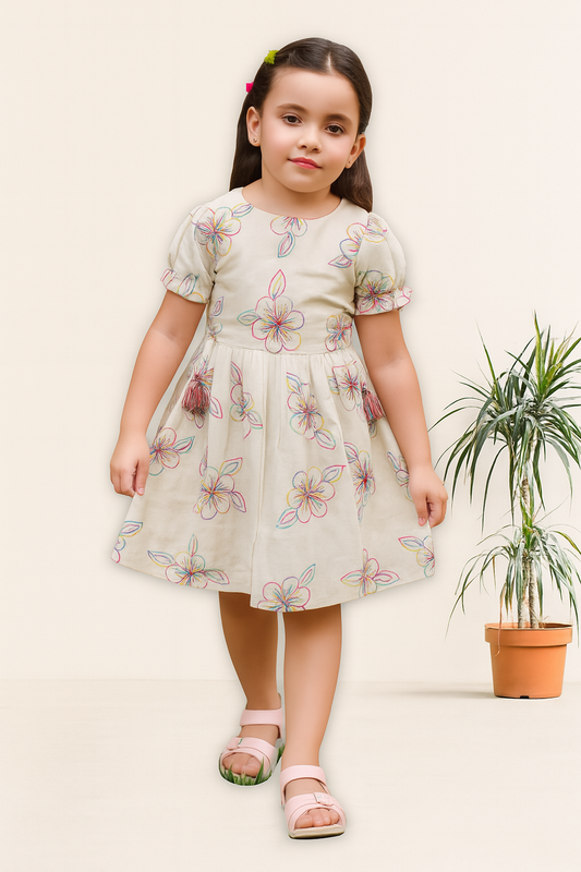 TINY TWILLS Girls Cotton Frock – Dress with Colorful Floral Thread & Tassel Tie-Up | Festive & Party Wear for Kids