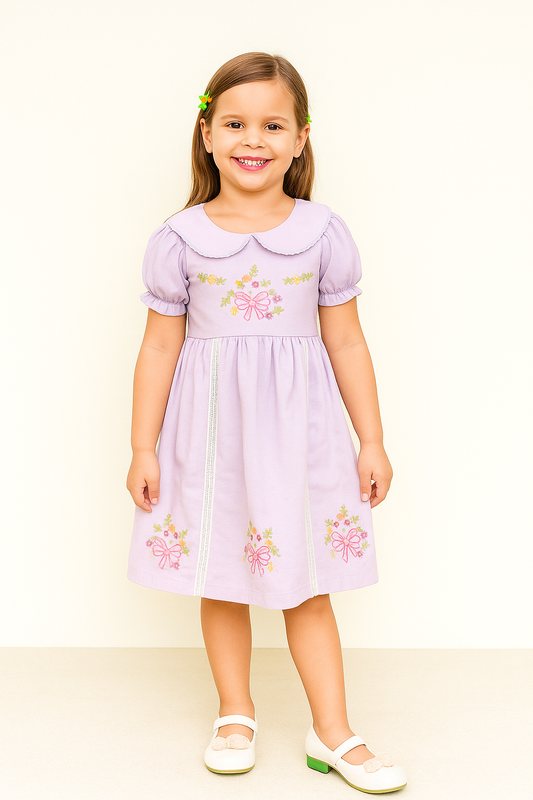 Tiny Twills Girls Cotton Frock – Lavender Dress with Embroidered Floral Bows & Peter Pan Collar | Princess Style Party Wear for Kids