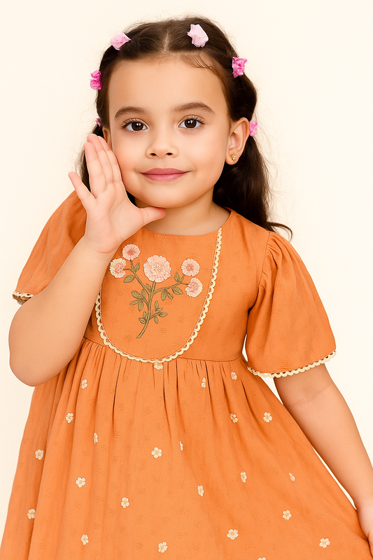 TINY TWILLS Girls Cotton Frock – Rust Orange Floral Embroidered Dress with Puff Sleeves & Dainty Lace Trim | Summer Party Wear for Kids