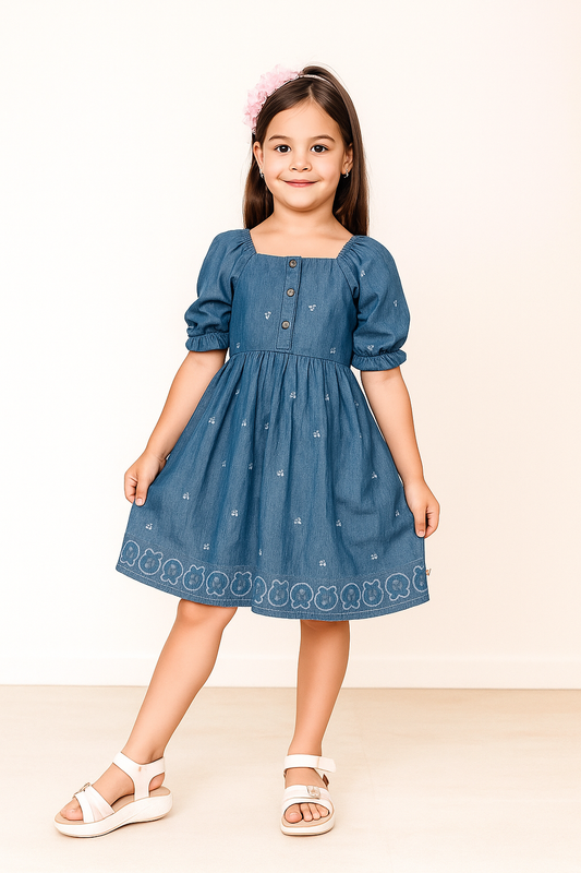 TINY TWILLS Girls Denim Frock – Blue Puff Sleeve Dress with Cute Animal Border Embroidery & Front Buttons | Trendy Casual Wear for Kids