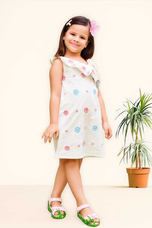 TINY TWILLS Girls Cotton Frock – Off-White One-Shoulder Dress with Floral Embroidery & Ruffled Neckline | Stylish Summer Wear for Kids