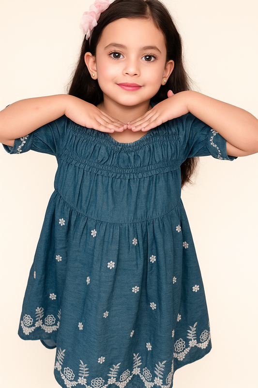 TINY TWILLS Girls Denim Frock – Blue Smocked Dress with White Floral Embroidery & Puff Sleeves | Trendy Casual Wear for Kids