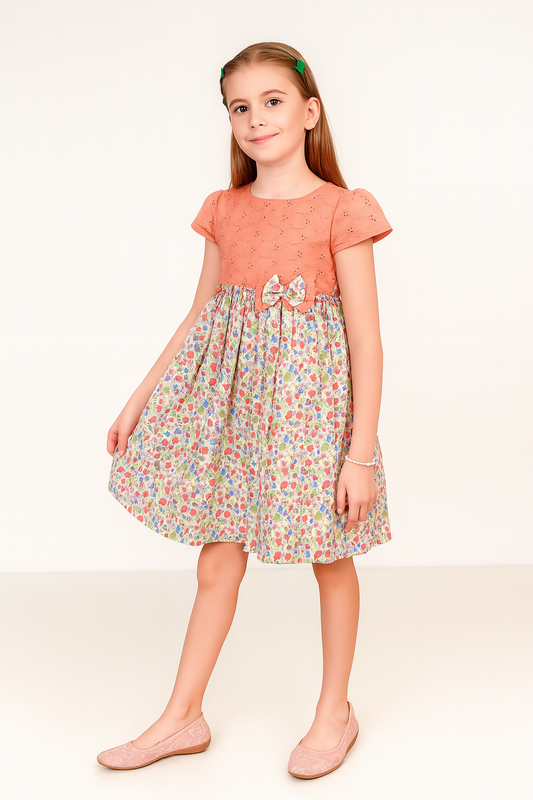 TINY TWILLS Girls Cotton Frock – Coral Eyelet Bodice with Colorful Floral Skirt & Bow Detail | Bright Summer Casual Wear for Kids