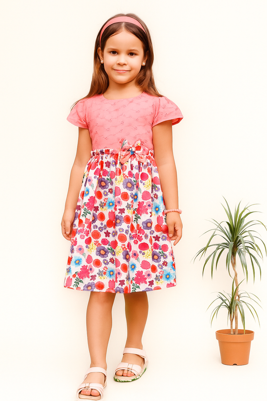 TINY TWILLS Girls Cotton Frock – Pink Eyelet Bodice with Colorful Floral Printed Skirt & Waist Bow | Bright Summer Casual Wear for Kids