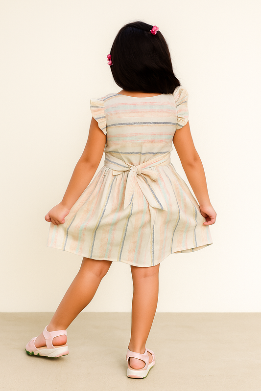 TINY TWILLS Girls Cotton Frock – Cream Striped Dress with Embroidered Pockets & Peter Pan Collar | Stylish Casual Wear for Kids