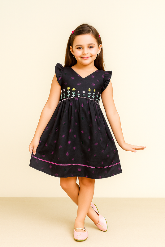 TINY TWILLS Girls Cotton Frock – Black Ikat Print Dress with Floral Embroidery & Flutter Sleeves | Stylish Ethnic Casual Wear