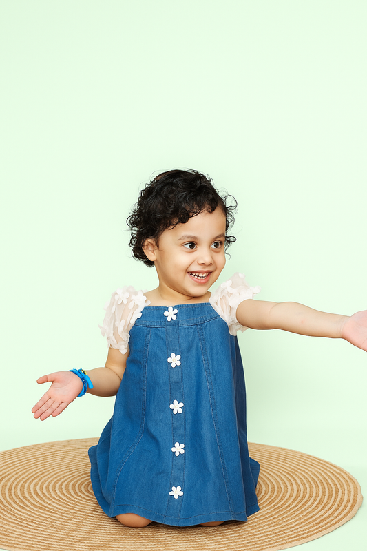 TINY TWILLS Blue Denim Frock with Floral Appliques and Sheer Sleeves