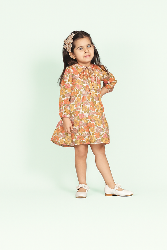 TINY TWILLS Orange Floral Print Full-Sleeve Frock for Girls