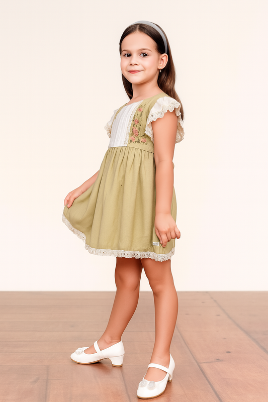 TINY TWILLS Girls Cotton Frock Embroidered Dress with Lace Sleeves | Party & Casual Wear for Kids