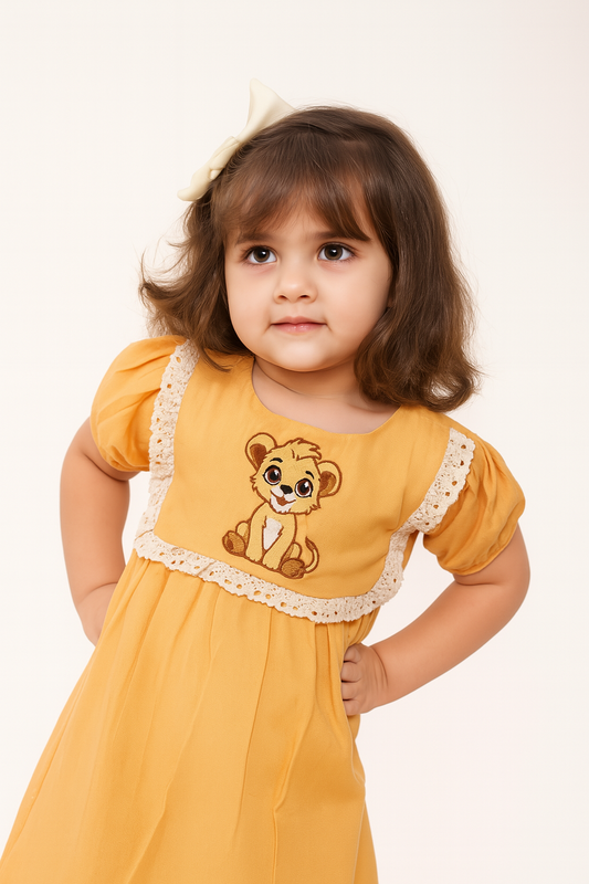 TINY TWILLS CUB EMBROIDERED FROCK WITH LACE ON YOKE