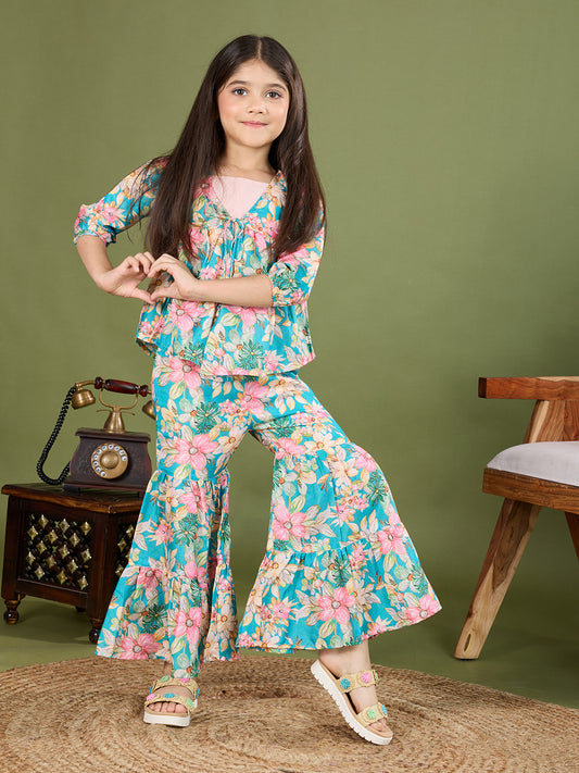Tiny Twills Girls' Tropical Floral Printed Co-Ord Set – Flared Pants & Shrug with Inner Top