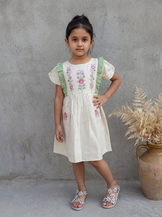 Elegant Off-White Cotton Gauze Jacquard Dress with Floral Embroidery and Green Schiffli Accents