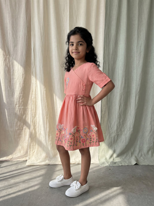 Elegant Angrakha Style Linen Slub Dress with Delicate Floral Embroidery & Appliqué Butterfly