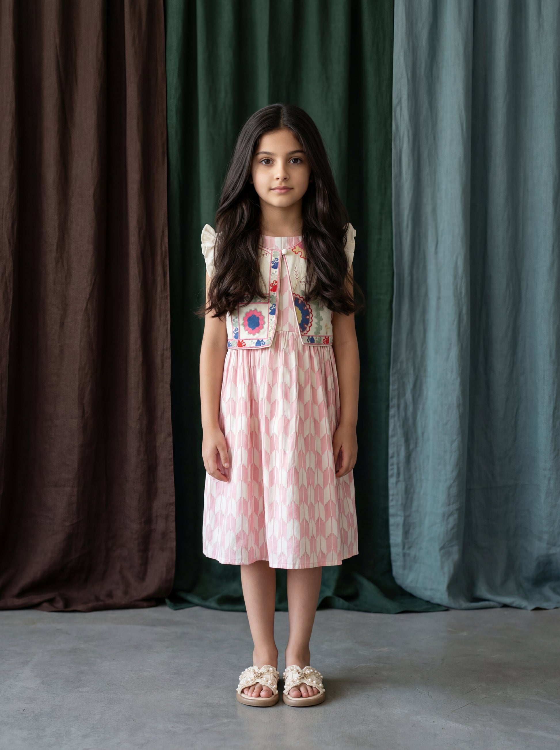 Elegant Cotton Jacquard Sleeveless Dress with Linen Embroidered Jacket for Girls